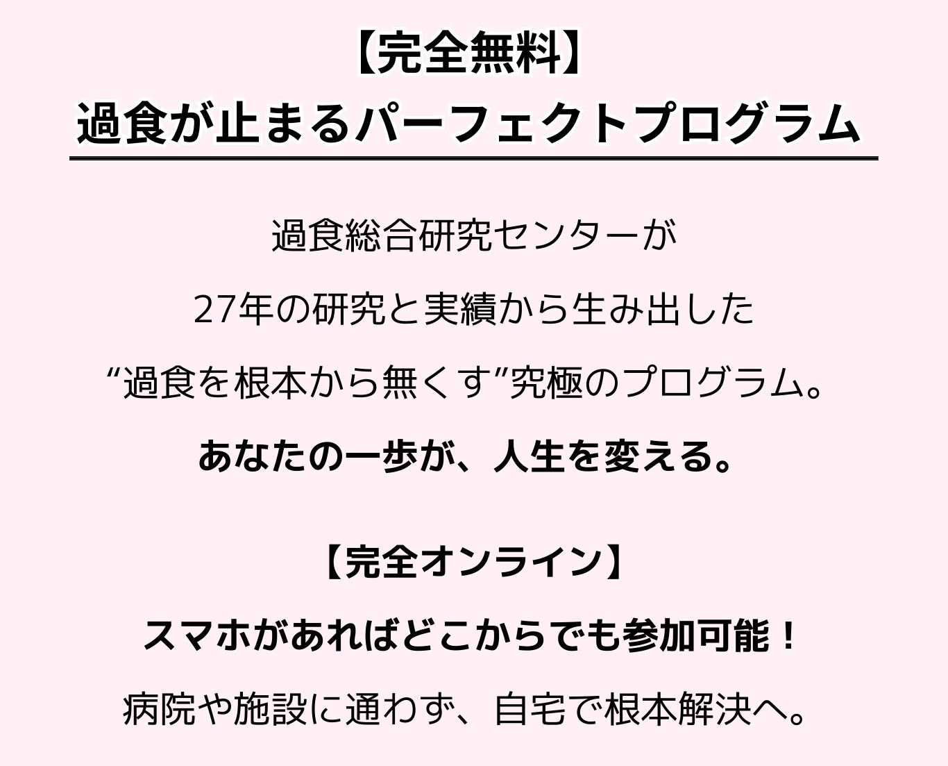 当センターは、過食衝動そのものを無くし、自然に過食が起こらなくなるプログラムを完全無料で提供しています。
